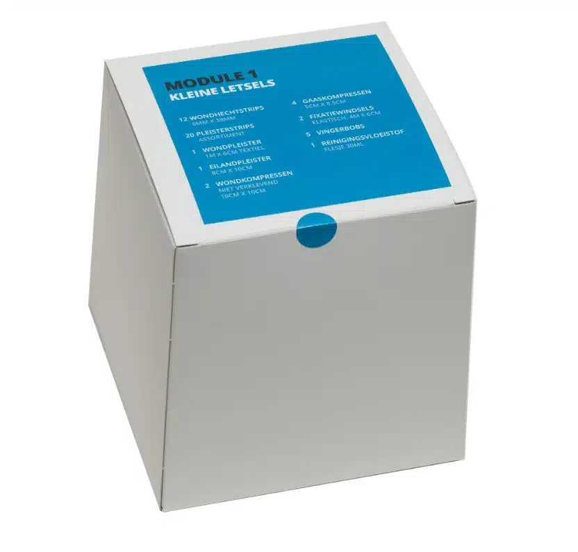 Deze Module is een onderdeel van de Modulaire EHBO koffer. De inhoud van module 1 is gericht op klein letsel zoals schaaf-, brand-, en snijwondjes aan bijvoorbeeld handen, voeten, ellebogen of armen.